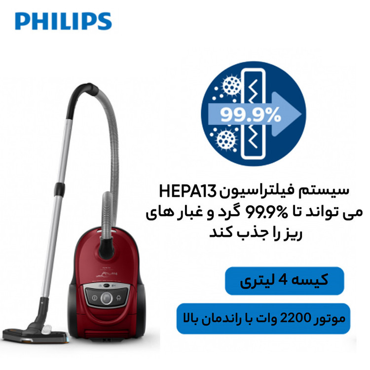 جاروبرقی «فیلیپس» مدل «FC9174/01» از جاروبرقیهای کوچک ولی پرقدرت این شرکت است. این مدل با توان موتور بالا و طراحی خاصش، توان مکش بسیار زیادی نیز در دهانه دارد و مدتزمان جاروکردن را کاهش میدهد تا در مصرف انرژی صرفهجویی شود. این جاروبرقی کیسهای مواد جمعآوریشده را در کیسهی مخصوص جمعآوری میکند و با گنجایش بالایی که دارد، وقفهای برای خالیکردن کیسه پیش نمیآید. پارویی (سر جارو) با طراحی خاصی که دارد، میتواند در هر گوشه و کناری فعالیت خود را به نحو احسن انجام دهد. لولهی تلسکوپی مدل FC9174/01 کوتاه و بلند شده و برای افراد با قد متفاوت تنظیم میشود. روی بدنهی جمعوجور این مدل، دو دکمه برای قطع و وصل جریان برق و همچنین جمعکردن سیم برق وجود دارد. پیچ تنظیم قدرت نیز در میانهی دستگاه وجود دارد. دستگیرهی جارو طوری طراحی شده است که هنگام بلندکردن به دست فشار نیاید. بدنهی دستگاه نیز در مقابل نشت هوا عایق شده است تا عملکرد دستگاه در بهترین حالت باشد. بهرهگیری این مدل از فیلتراسیون HEPA13 باعث میشود هوای خروجی از دستگاه پاک باشد و گردوغبار به هوا بلند نشود. وجود سیم برق بلند و همراهی آن با طول خرطومی و لوله پوشش مساحت بیشتری را ممکن میسازد. این جارو با عملکرد فوقالعادهی خود، محصولی پرفروش محسوب میشود. فیلیپس سالها در تولید لوازمخانگی برقی سابقه داشته و طرفداران زیادی در سراسر جهان دارد.