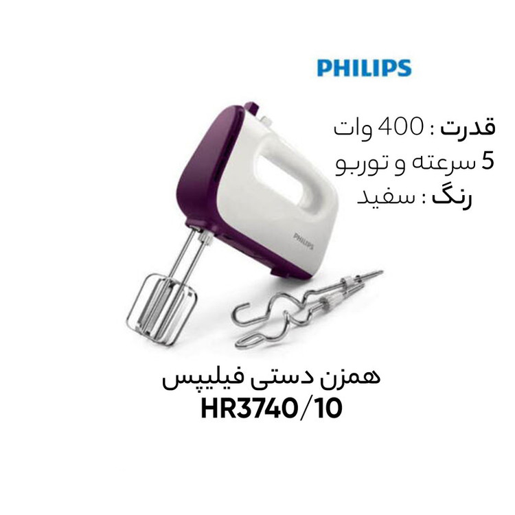 همزن «فیلیپس» (Philips) مدل «HR3740/10» دستگاهی بسیار مفید و کارآمد در آشپزخانه است. این همزن با توان 400 واتیاش میتواند در تهیه و ترکیب مواد اولیه آشپزی و شیرینیپزی کمک شایانی به مصرفکننده بکند. سَریهای مختلف همزن بهصورت جفتی کار میکنند و هر چیزی را مخلوط کرده و هم میزنند. برای همزدن مواد مختلف، میتوان دستگاه را در پنج سرعت متفاوت تنظیم کرد. درنتیجه میتوانید با توجه به مواد اولیه، سرعت را تنظیم کنید؛ همچنین با قراردادن همزن در حالت توربو، سرعت آن افزایش یافته و در زمان کم مواد را با یکدیگر مخلوط میکند. سَریهای همزن بهراحتی از دستگاه جدا و شسته میشوند. همراه آن دو عدد تیغهی خمیرزن ارائه میشود که برای درستکردن نان و خمیر بسیار کارآمد هستند. اتصال آنها به همزن بسیار ساده است. طول کابل همزن 1.2متر است. با تهیهی این همزن خوشساخت، آشپزی و شیرینیپزی با سرعت و لذت بیشتری انجام میشود. این محصول برای آشپزی روزانه و حرفهای قابل استفاده است.