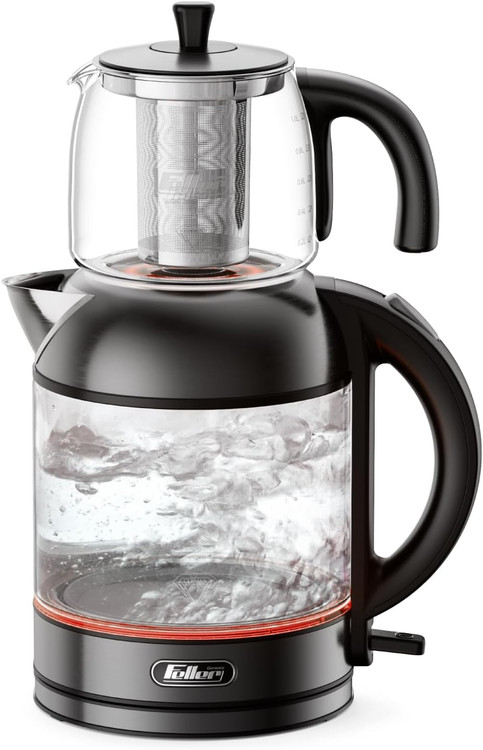 نوع دستگاه چای ساز روی هم توان مصرفی 2200 وات نوع گرمایش المنت حرارتی مخفی ظرفیت کتری 2 لیتر جنس کتری شیشه ای و استیل ظرفیت قوری 1 لیتر جنس قوری شیشه ای جنس کف داخل کتری استیل ضد زنگ: 2200وات